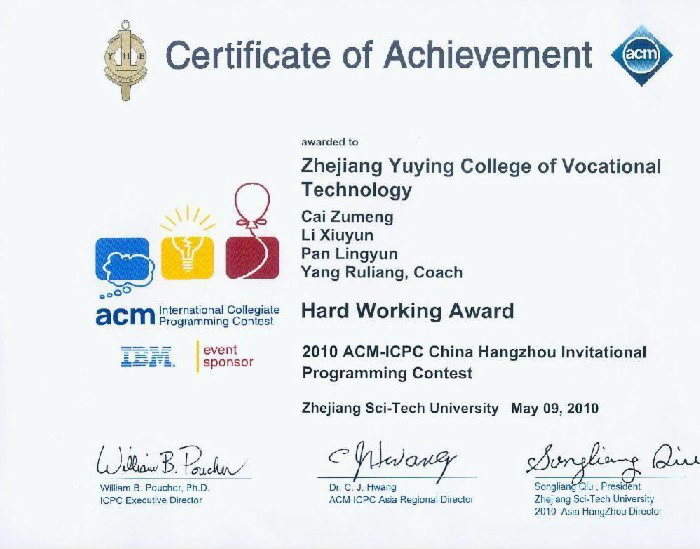 “通普杯”2010 ACM大学生程序设计竞赛全国邀请赛5月8日至9日在浙江理工大学举行,来自全国包括北京大学、浙江大学、复旦大学、武汉大学、东南大学在内的全国34所高校共计98支代表队参加了这场比赛。我院是这次邀请赛的唯一一支专科队伍。