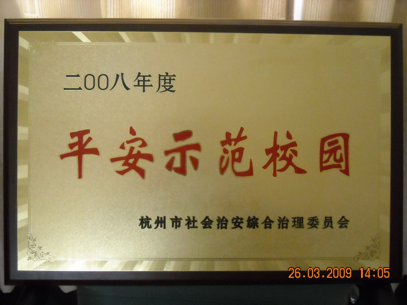 2009年3月下旬,从杭州市教育局传来喜讯,我院通过了杭州市教育局、杭州市公安局、杭州市综治委审核评比,荣获杭州市“平安示范校园”的荣誉称号。我院平安稳定工作得到杭州市各部门的充分肯定,并颁发了“平安示范校园”的奖牌。
