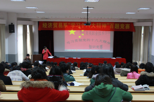 深入学习十八大精神,全员参与百题知识竞赛 为了更好地搞好党团的建设,丰富同学们的精神生活,增强同学们对党团的认识,让同学们进一步学习党的十八大精神。经济贸易系党总支在学院党委的指导下,结合本系实际,于 本次活动的开展,更好的巩固了之前党章学习小组的学习情况。在竞赛前,党章小组组长参与了系部的十八大精神学习。各个党章小组组长为了更好的参与此次百题知识竞赛,各小组长们在赛前多次开展了学习十八大精神知识竞赛会议,与小组成员们共同学习,共同讨论。 竞赛时间还没到,一号报告厅已坐满了参赛学生,经贸系各党章小组的组长也正有序的将小组成员依次入座。竞赛在系党总支组织员宣读竞赛规则以及注意事项后,各支部书记清点人数,分发试卷,确定无误,正式开始。竞赛中,同学们都信心十足,认真答题,发挥稳定,将自己所了解的,掌握的十八大知识卸载试卷上,报告厅内,只听齐刷刷的写字声。 活动开展了近一个小时,通过此次竞赛让我感受到了浓浓的十八大精神韵味,活动不仅仅是让团党知识更好的融入我们的生活,带来一片新天地,同时也可以寓教于乐。不管竞赛有无获奖都不重要。竞赛活动只是一种形式,更重要的是为了加强同学们对党的认知与学习,更好的贯彻学习党的十八大精神,并同时将此学习精神延续,传达给更多的同学,提高大学生的社会责任感,对党团的认真感,也让我们感受到了我们新一代年轻人的激情和爱国情怀。 经济贸易系党总支 2012年12月31日
