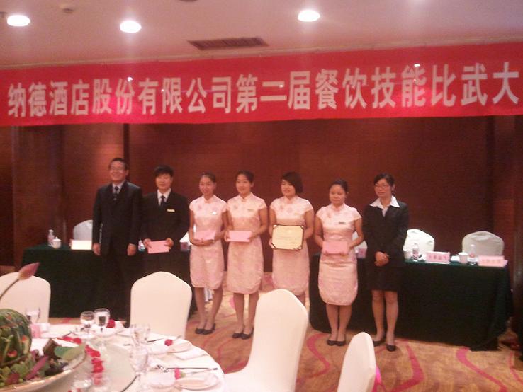 201392下午2点在杭州纳德大酒店四楼宴会厅举办杭州纳德酒店股份有限公司第二届餐饮技能比武大赛。我院酒店教研室徐芳老师对纳德酒店的此次比赛进行了技术指导,对于餐饮技能比武的组织形式、比赛内容、技术标准、评分标准等都给出了专业的意见。徐芳老师还担任了此次比赛的特约评委、颁奖嘉宾。而我们纳德班的学员姜瑜欢和许楚楚两位同学因为在纳德自由酒店表现突出,而被推选为自由店的参赛团队成员参加了此次比赛。两位同学在比赛过程中,分别担任宴会主题解说和斟酒的任务,表现均非常突出。尤其是姜瑜欢同学在解说宴会主题时能够做到完全脱稿,在对台面设计、菜单设计、中心装饰物设计的介绍能够结合自己的理解,深入地、有重点地给评委做了介绍,整个介绍表达清楚,仪态优雅,手势到位,得到了集团副总宋长鹰先生的点名表扬。最后,由我们学生参加的纳德自由店组获得了团体第二的成绩,对于刚刚在酒店实习1个多月的学生来说这是非常不容易的。此次比赛,让老师和同学都学到了很多。作为老师,这是一次与行业深入交流的机会,作为学生,这是一次检验学习和实习成果的机会。