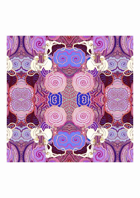 《猿儿》系列,运用各种线条和几何图形组成的图案,把现代与古代相结合。 以强烈的颜色对比,突出四周猴子在玩耍的形象。整幅画以平面的形式展示,整体视觉效果放在方巾上很舒适,吸引眼球。