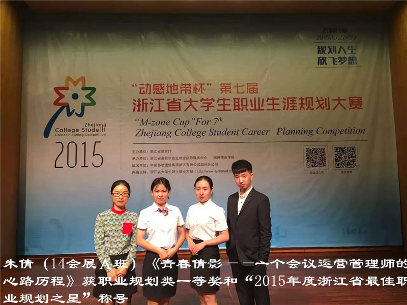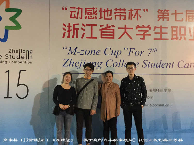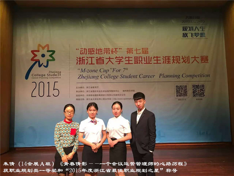 经过激烈比拼,我院创意设计分院学生朱倩(14会展A班)《青春倩影——一个会议运营管理师的心路历程》获职业规划类一等奖和“2015年度浙江省最佳职业规划之星”称号;信息技术分院学生沈夏(14计应3+2班《U一点!料为U而来》获职业规划类二等奖;商务贸易分院学生高家栋(13营销A班)《在场App——属于您的汽车私家顾问》获创业规划类二等奖;民航交通分院学生张文雯(14轨道A班)的《贯穿地道的一抹阳光》获职业规划类三等奖;商务贸易分院学生陶梦娜(14国贸A班)《乐于规划 享之明天——乐享街网络有限公司》和创意设计分院学生周依静(14会展3+2班)《老有所依,静养天年——颐养院创业实录》分别获创业规划类三等奖。饶芸、朱晓玲、赵瑞晔分获“优秀指导教师奖”。指导老师还有:徐丹、林必成、蒋玥、姜蕾、夏天、陈璐、赵燕、田翔、余国浩、文艳、罗妮娜、王琼。