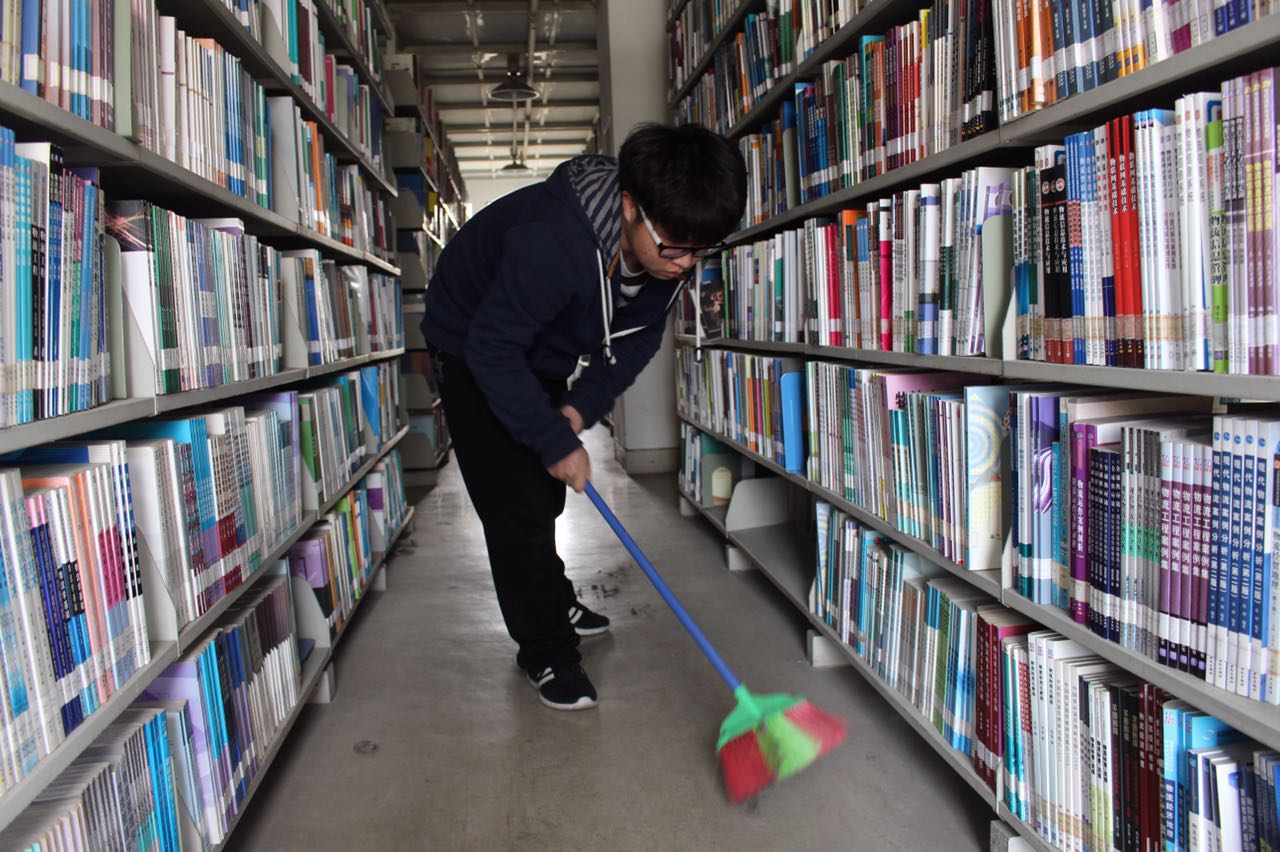 同学们在图书馆管理员老师的指引下,分成若干小组,明确了清洁的区域和任务。有的同学负责拖地,有的负责擦书架,有的帮忙洗抹布。各司其职,井然有序。经过近一个小时的打扫,图书馆呈现了干净整洁的新面貌。虽然同学们放弃了自己的午休时间,但却毫无怨言,面对自己的劳动成果,喜悦之情不言而喻。