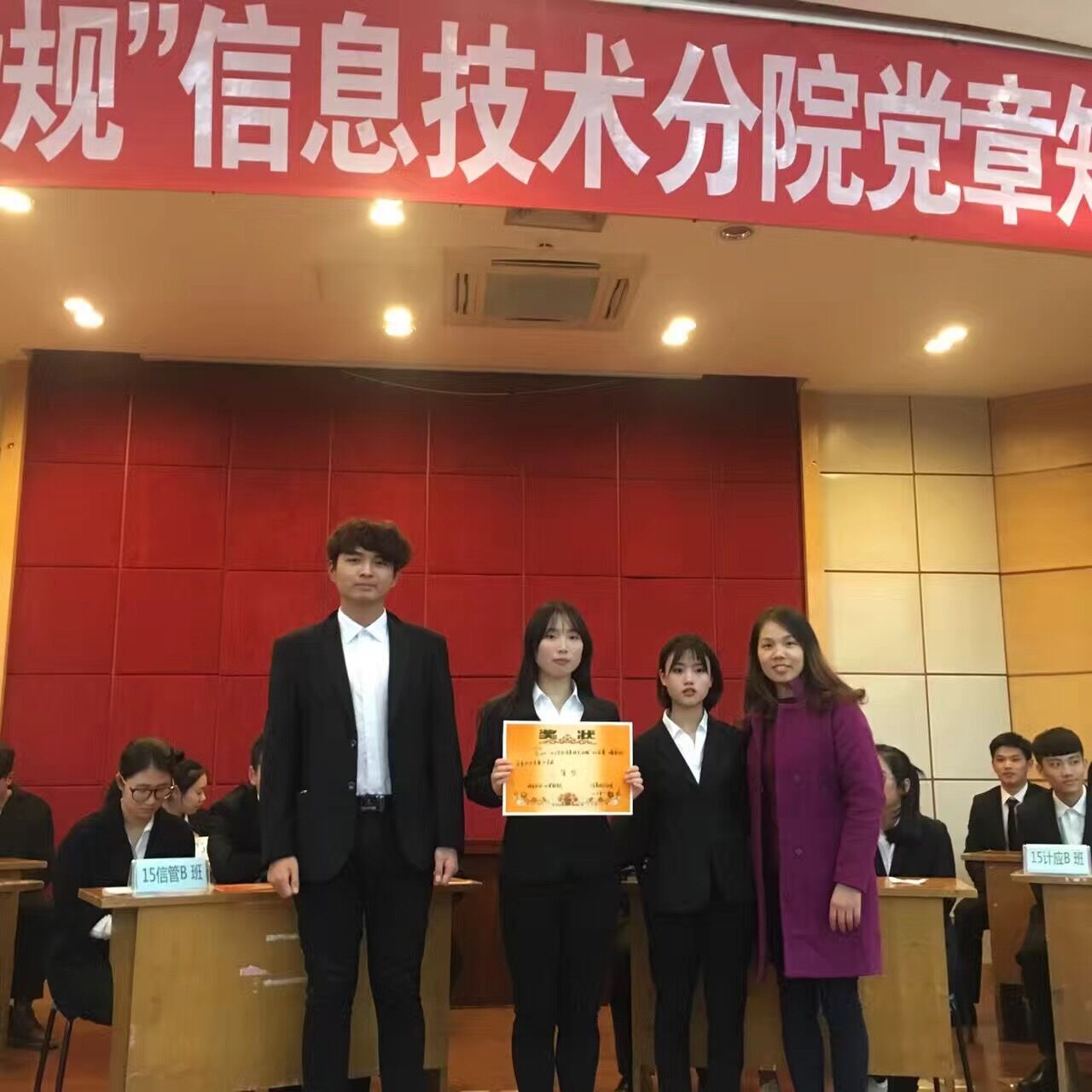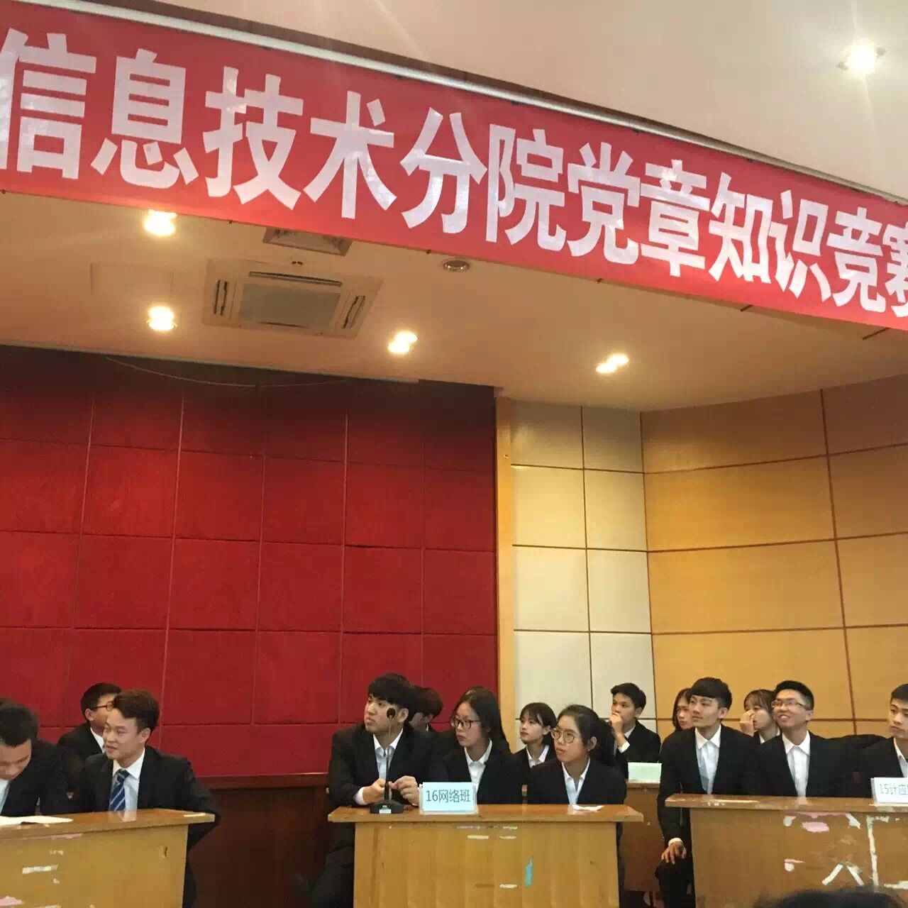 2016121日晚,“知党章、懂党规”信息技术分院党章知识竞赛圆满结束。本次比赛分初赛和决赛,初赛面向分院大一大二全体学生,以笔试的形成进行,最终进入决赛的代表队是15计应A15计应B15信管A15信管B16信管B16计应3+2B16网络,16通信。