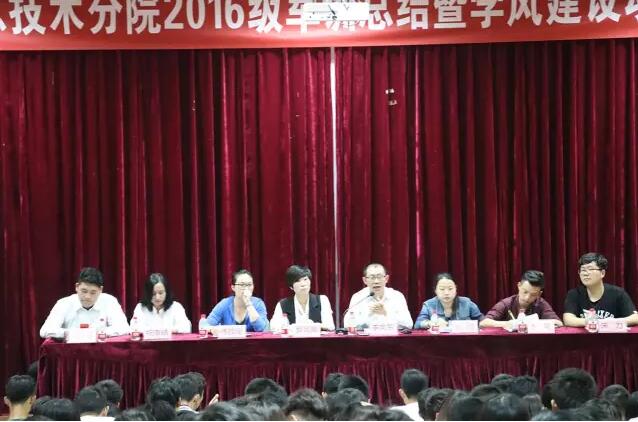 10月16日18:40,信息技术分院2016级军训总结暨教学巡查动员会在一号楼报告厅拉开帷幕。 出席本次会议的有分院副院长李向东老师、党总支副书记罗妮娜老师、团总支书记傅晶瑶老师、各班班主任、学生会主席朱力、副主席杨仲豪同学以及各班助和16级全体学生。
