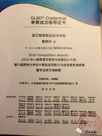 2016年8月22日,第六届两岸大学生计算机应用能力与信息素养海峡赛在台湾举办,我院信息分院学生朱力荣获计算机综合应用能力ICT高职组三等奖。指导老师何燕飞、易明升。朱力在之前的第六届全国大学生计算机应用能力与信息素养大赛总决赛获一等奖,故获此次参赛资格。
