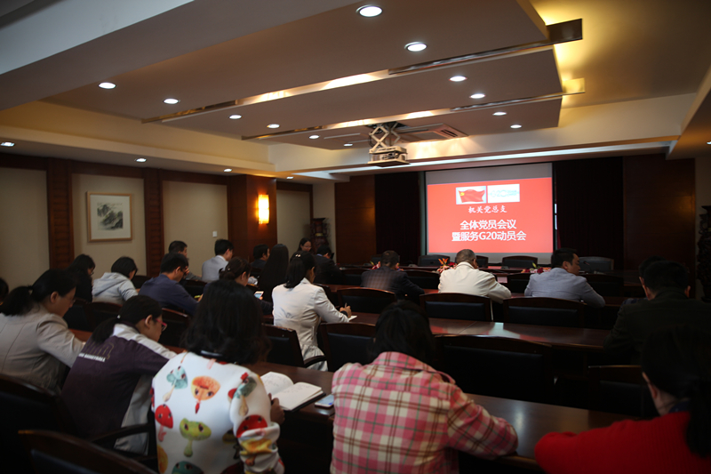 2016年4月25日中午,机关党总支服务G20峰会动员大会在综合楼十楼会议室召开。机关全体党员参加会议。应机关党总支邀请,学院院长洪致平作重要讲话,机关党总支书记夏瑛主持会议并做动员报告。