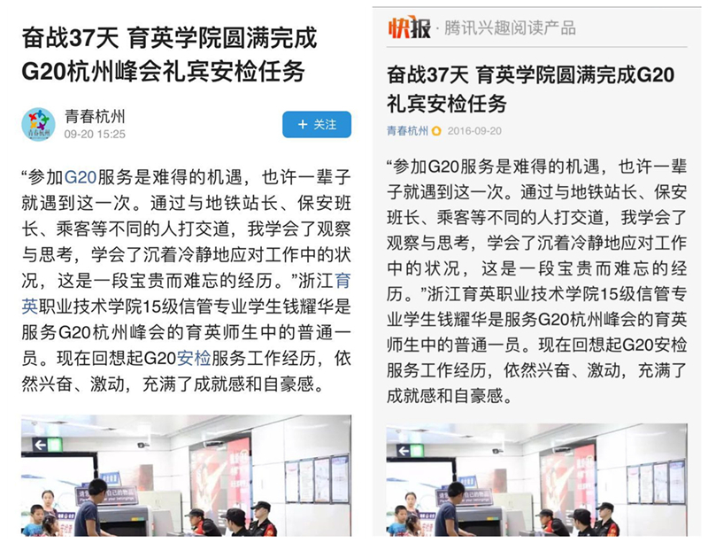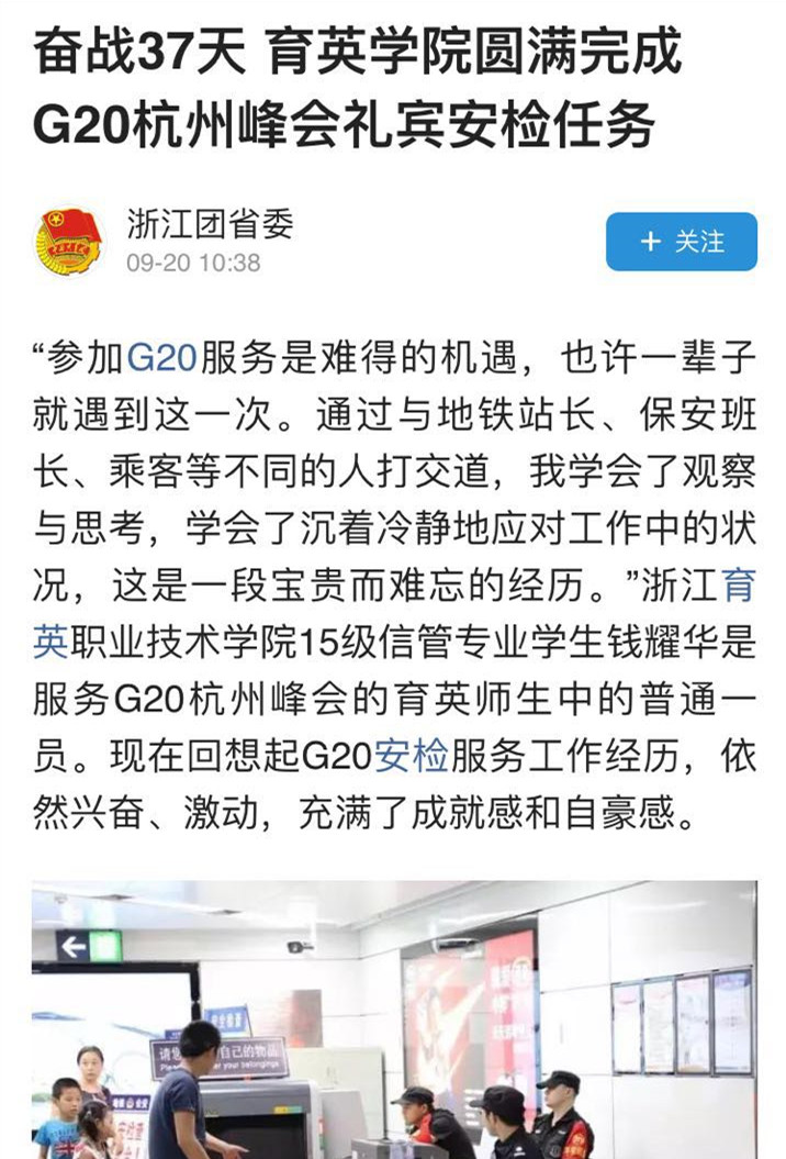 9月10日,我院最后一批服务G20的师生凯旋,育英人不辱使命,圆满完成了所有服务G20杭州峰会的礼宾和安检任务。杭州日报、浙江教育报、浙江新闻客户端、杭州网、浙江团省委头条号、杭州团市委头条号、杭州共青团微博等媒体报道了我院这次光荣而重大的任务。