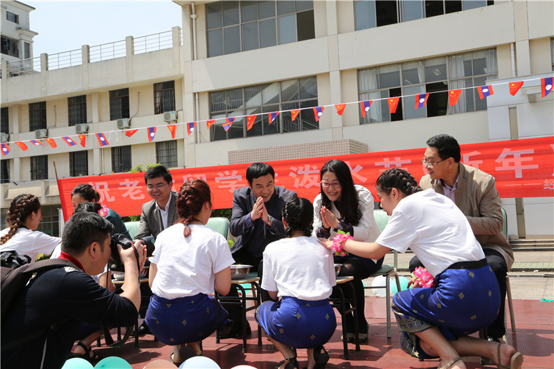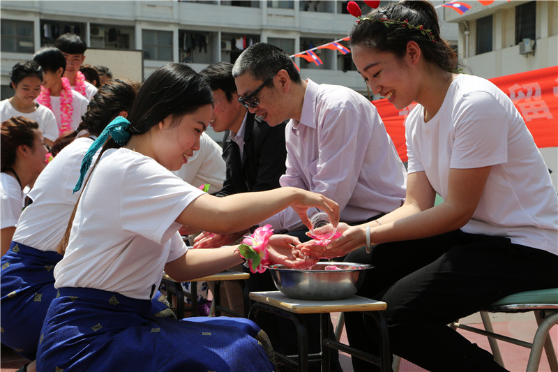 老挝留学生们也为到现场的老师们举行浴手礼。这是老挝人的传统习俗,也是老挝留学生向老师们表达感激之情。