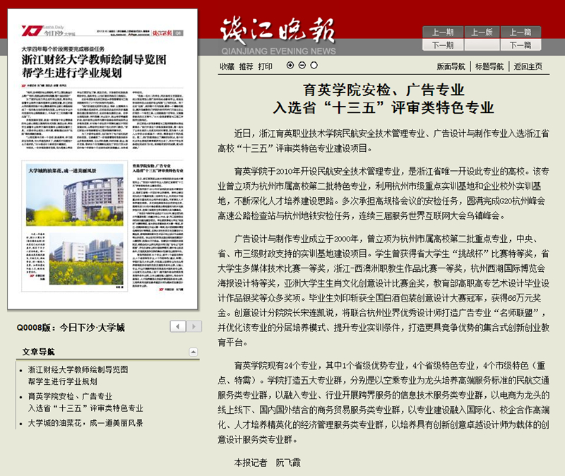 【钱江晚报】育英学院安检专业和广告专业 入选省高校“十三五”评审类特色专业建设项