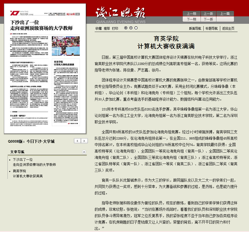 全国共有8所高校的18支队伍参加沧海竞舟组竞赛。经过3小时顽强拼搏,育英学院三支队伍总分达到2289分,在沧海竞舟组排名第一,在全国211、985组成的珠峰争鼎组45所高校中排名第37,在本科高校组成华山论剑组的178所高校中位列74。育英学院最终获得:全国高校特等奖(沧海竞舟组)、全国团队一等奖沧海竞舟组(育英一队)、全国团队二等奖沧海竞舟组(育英二队)、全国团队三等奖沧海竞舟组(育英三队);浙江省高校特等奖、浙江省团队特等奖(育英一队)、浙江省团队一等奖(育英二队)、浙江省团队二等奖(育英三队)奖项。
