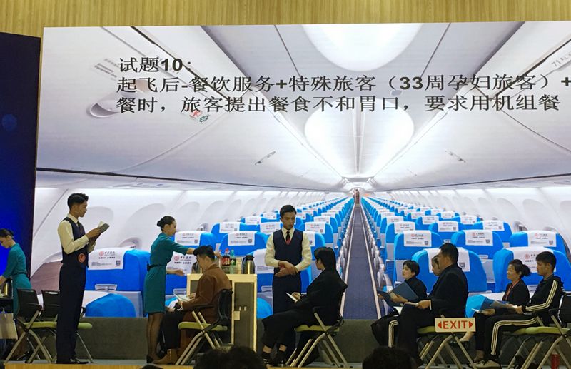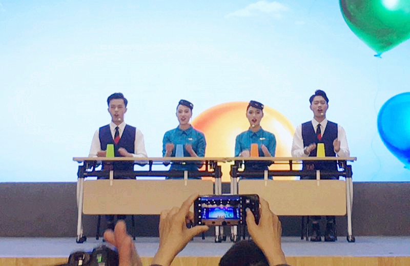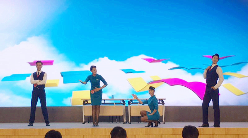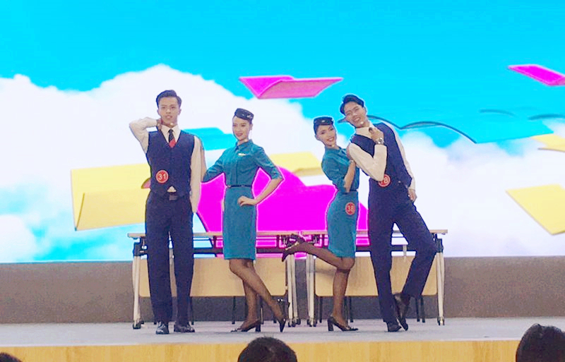 本次比赛涵盖空乘理论知识、客舱服务技能以及乘务英语能力等方面的综合考核,进行了职业风采展示、民航知识测试、客舱服务模拟等三个环节的技能展示。职业风采展示环节,八名选手通过舞蹈、歌曲、礼仪、情景模拟等多样化的才艺展现了育英学子的风采。在客舱服务模拟环节,评委直接坐在飞机座位上对学生客舱服务的能力进行打分,充分考核学生的客舱服务能力、客舱广播能力以及应急处理能力。
