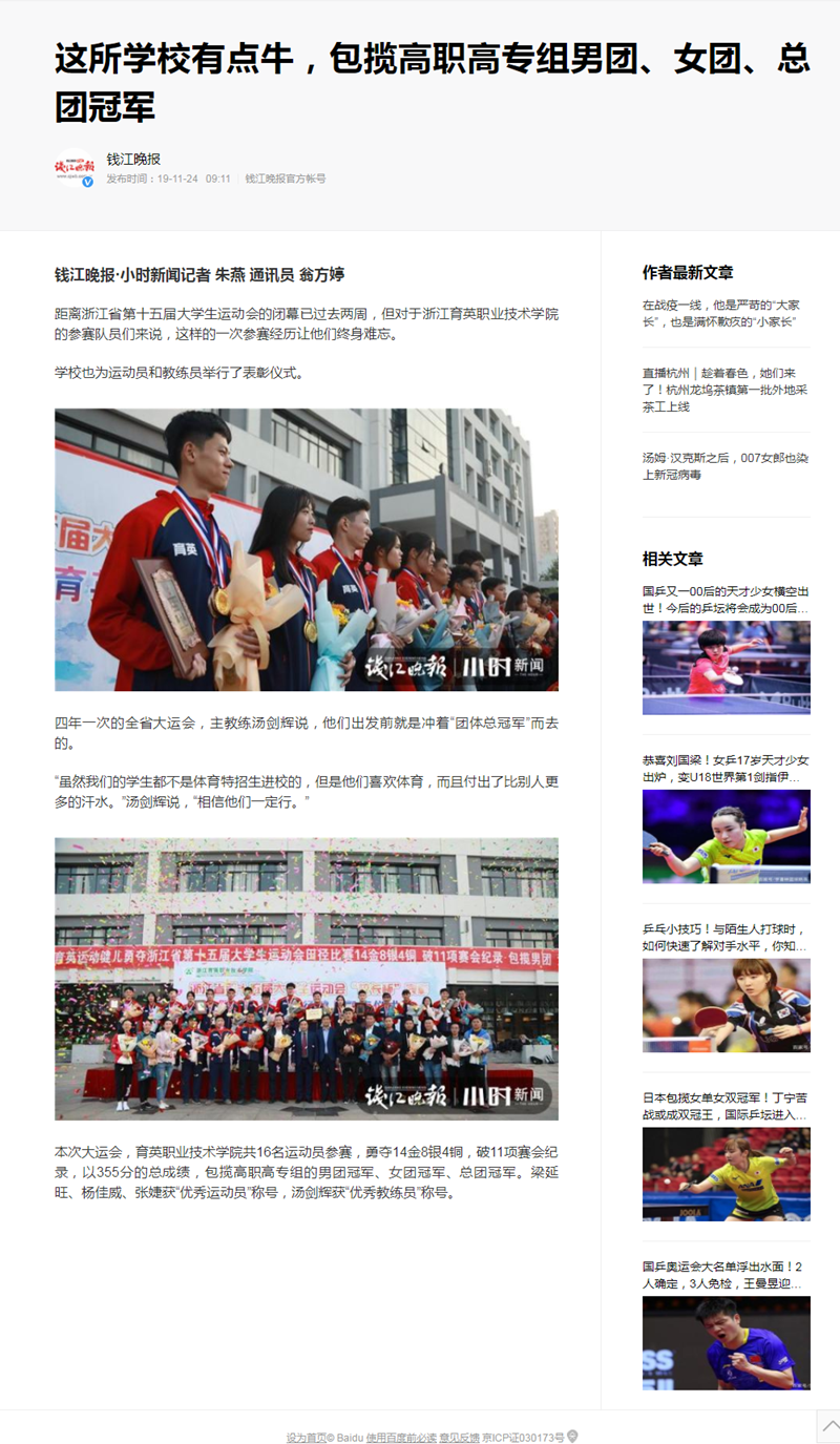 【钱江晚报】这所学校有点牛,包揽高职高专组男团、女团、总团冠军