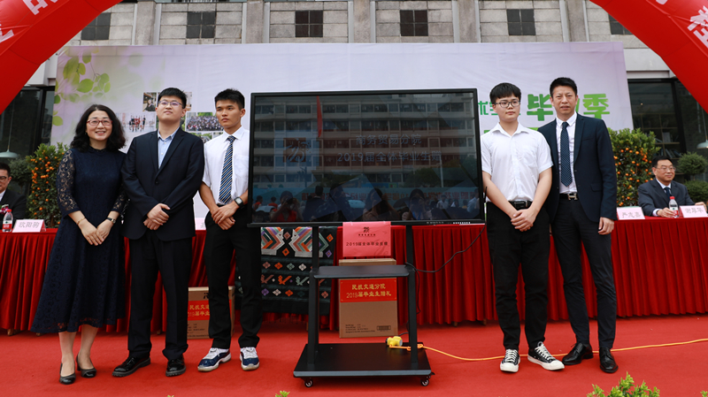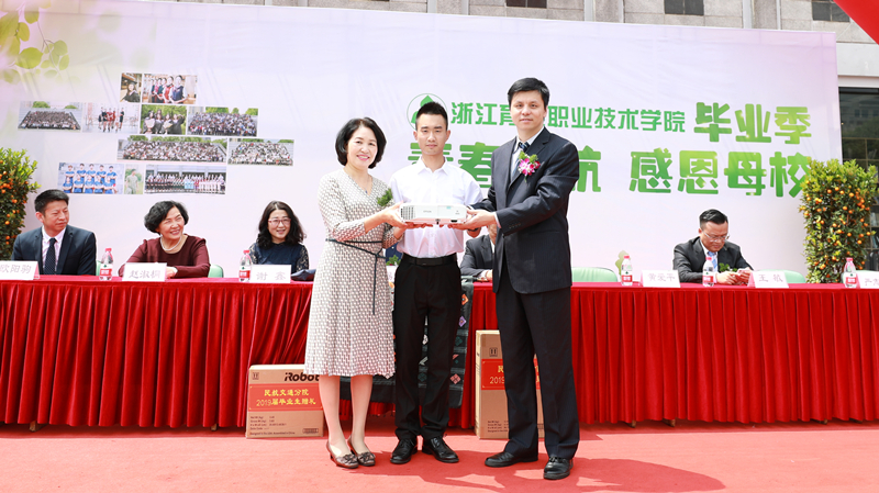 毕业典礼第二场在教学楼广场上举行。党委书记、常务副院长王锡耀主持真情回报母校环节。毕业生们献上精心准备的礼物,回报母校的培育之恩。