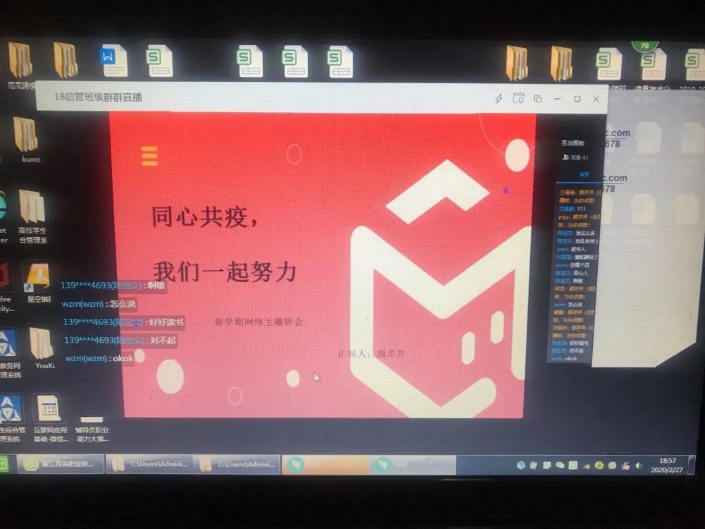 2020年2月27日晚上7点整,18信管全体同学齐聚钉钉群,召开以“同心共疫,我们在一起”网络主题班会。学院副院长谢鑫、学院学生处长王贤军、分院党总支书记赵瑞晔以及信息分院全体学工老师观看了直播。