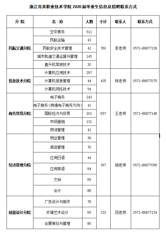 学院立足杭州、面向浙江、融入长三角,为现代服务业培养全面发展的具有优势品质与技能的高素质应用型职业人,开设了空中乘务、直升机驾驶技术、轨道交通运营管理、计算机应用技术、计算机网络技术、电子商务、国际经济与贸易、酒店管理、会计、广告设计与制作、人物形象设计等24个专业,在校学生7500余人,累计为国家和社会培养合格毕业生30000余人。