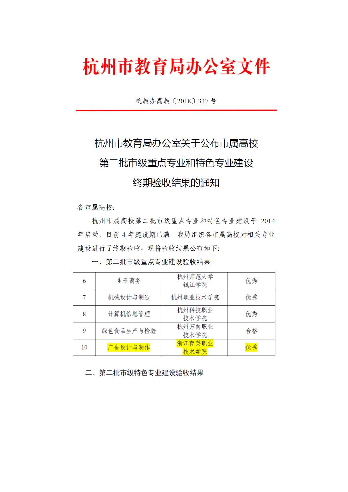 近日,杭州市教育局办公室发布了《杭州市教育局办公室关于公布市属高校第二批市级重点专业和特色专业建设终期验收结果的通知》(杭教办高教〔2018〕347号),我院广告设计与制作专业和民航安全技术管理作为第二批市级重点专业建设和特色专业建设验收结果均为优秀!