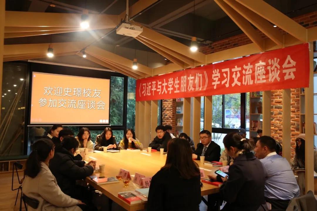 本次座谈会特邀学院2001级计算机信息管理专业史璟校友参加。史璟校友作为书中受访者之一,与社团管理中心的同学们分享了习总书记2003年视察学院、来到学生社团活动中心的故事。他说当时作为社团活动中心主任,很幸运亲身经历现场并有机会参与接待,这次《习近平与大学生朋友们》出版发行,让他又重温了珍藏在心底的难忘瞬间。