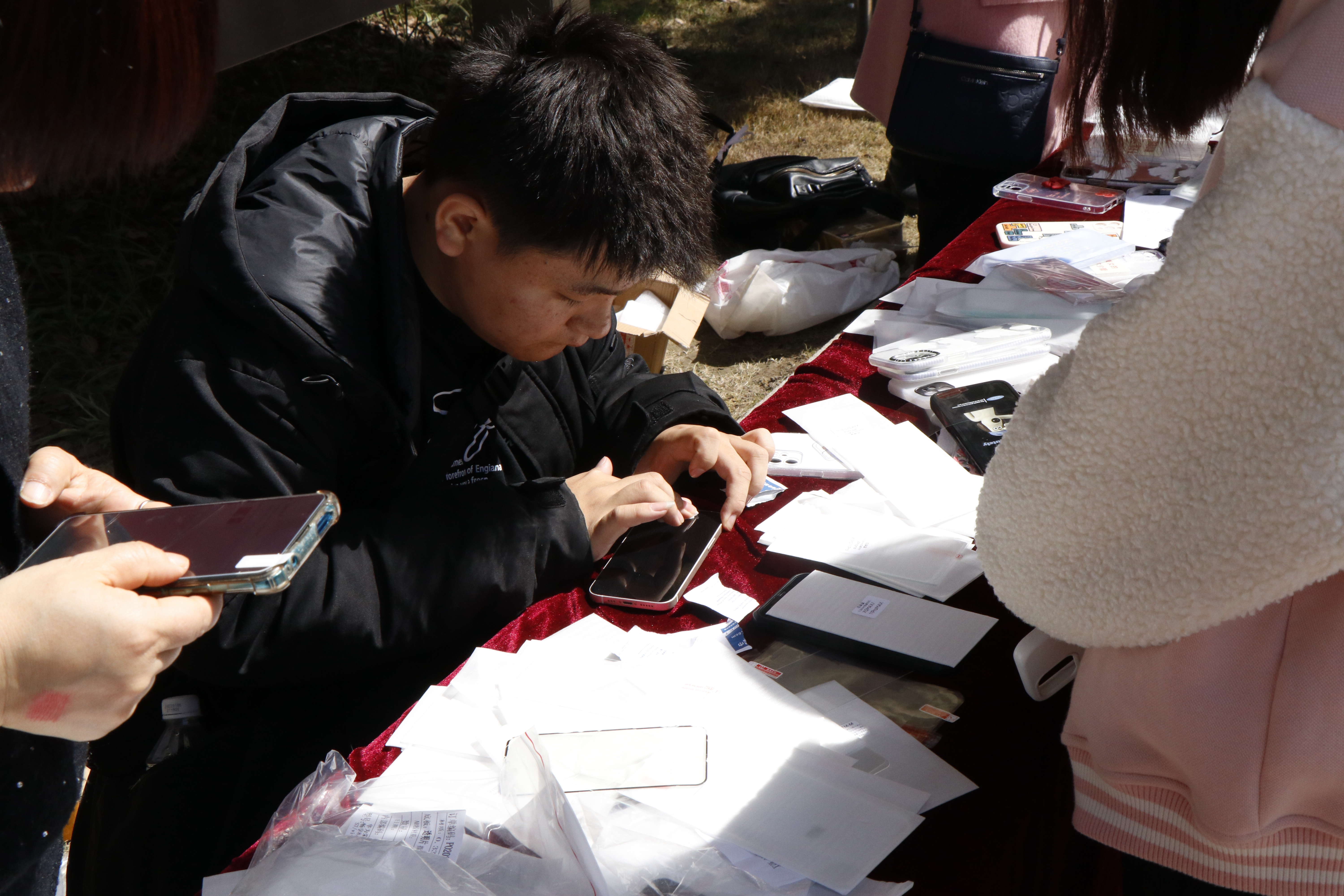 活动原计划12点30开始,热情的教工女神们12点便被我们的招牌吸引,纷纷驻足,开始挑选手机外壳、外膜、手机支架、数据线、数码清洁套装、转接头等精美礼物了。于是,我们当即决定,马上为女神们服务。贴膜的同学,拿出12分的专业,陈静、徐利华、陈薇、刘清华、应梦茜等老师匆匆放下碗筷,第一时间飞至现场,为老师们服务。