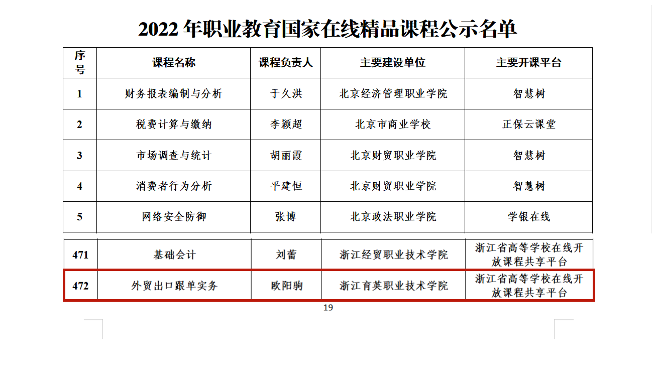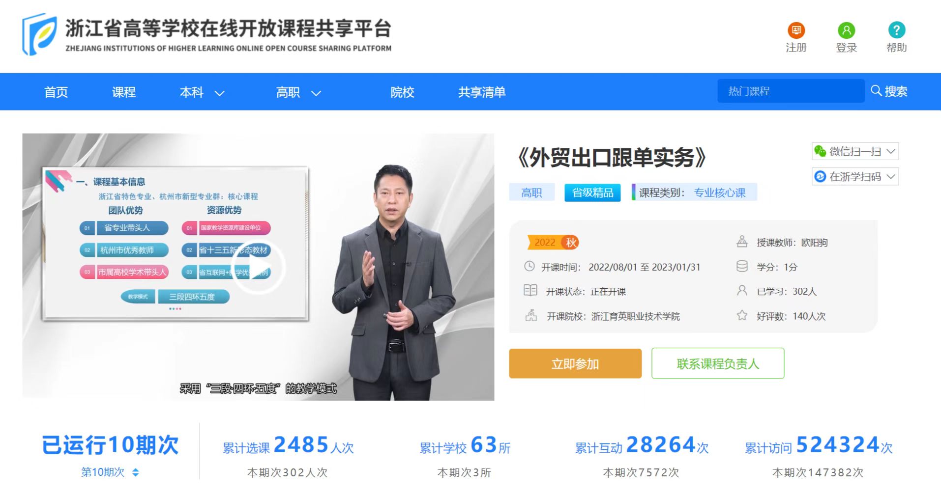 《外贸出口跟单实务》是2018年立项的省级精品在线开放课程,是国际经济与贸易、国际商务、跨境电商专业的岗位核心课程。课程充分发挥省高职高专专业带头人、市属高校中青年学术带头人、杭州市优秀教师等师资构成的教学创新团队和职业教育国际贸易专业国家教学资源库升级改造项目、省十三五新形态教材、省互联网+教学优秀案例等教学资源优势,采用“三段 四环 五度”的教学模式,教学相长、知行合一,围绕教学目标,培养适应外贸行业发展的高素质、复合型外贸人才。