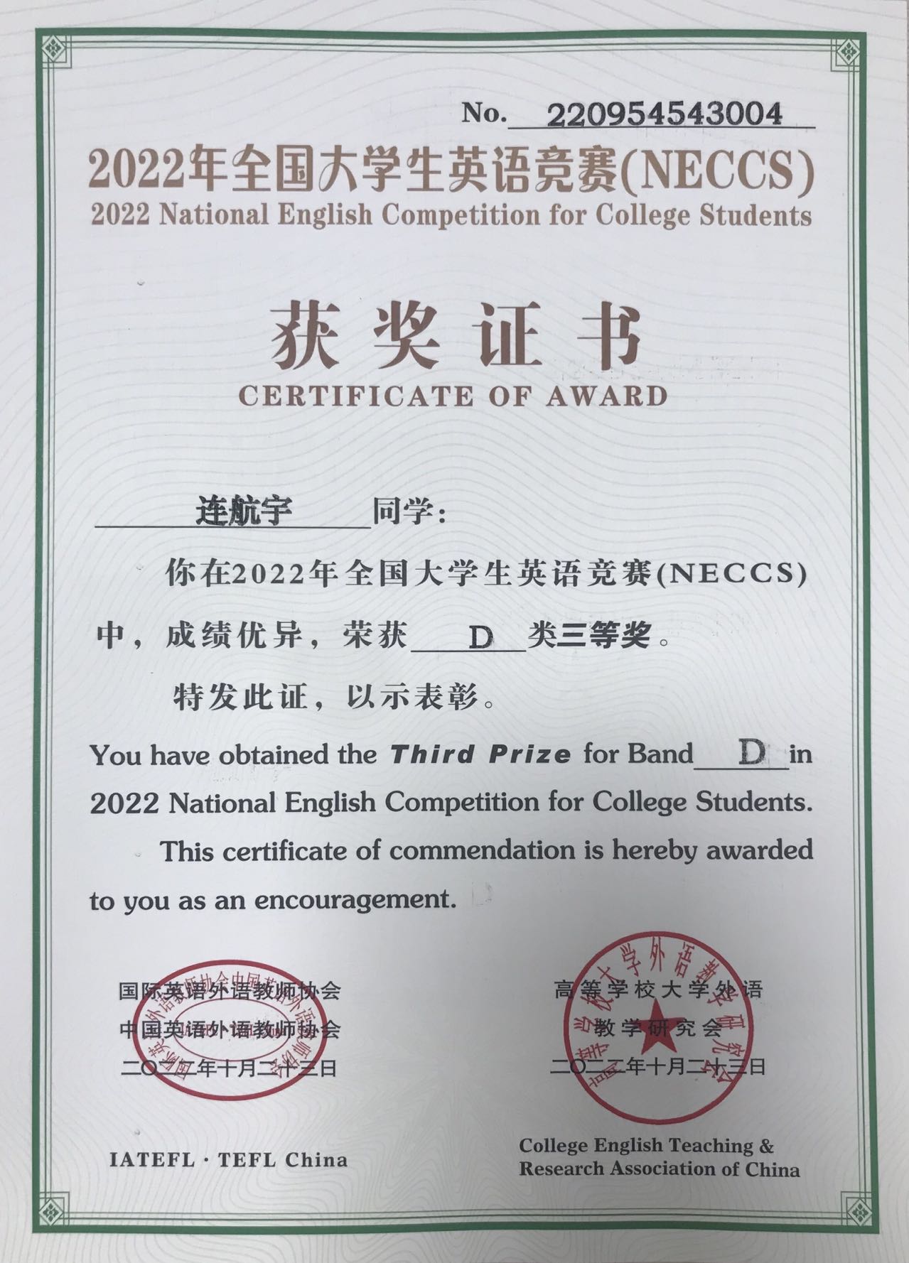 2022年全国大学生英语竞赛(NECCS)全国决赛于2022年10月23日落下帷幕,全国24个省级赛区顺利进行。智慧旅游学院21级酒店专业学生郝露筱、连航宇、吴佳麒三位同学参加2022年全国大学生英语竞赛(NECCS)获得二等奖、三等奖。