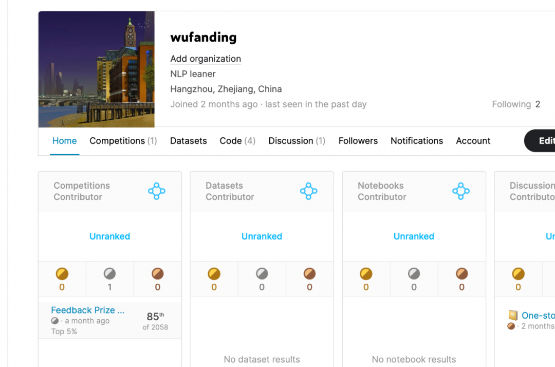 在Kaggle平台上,每位选手参加过的竞赛、排名和分享的资料,都会记录并显示在个人主页。参加Kaggle平台的高质量竞赛,获得好名次,是实力的极好证明,也给丁吴凡的履历增添了耀眼的一笔。