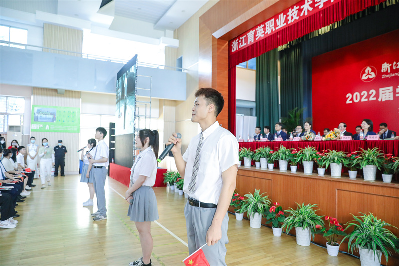 全体毕业生在谢鑫主持下,举行毕业礼,毕业生代表向教职工代表、家长代表、企业代表献花。