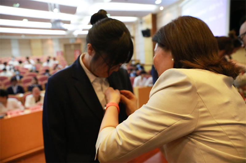 黄爱平与王燕茹共同签约,王敏与王燕茹校企双方互授牌,黄华与王燕茹共同为育英-长乔现代学徒制班揭牌。校企领导为现代学徒制班学生授班徽,王燕茹为现代学徒制班学生颁发奖学金及礼品。
