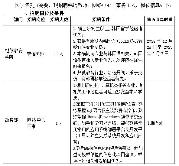 诚聘韩语教师、网络中心干事各1人
