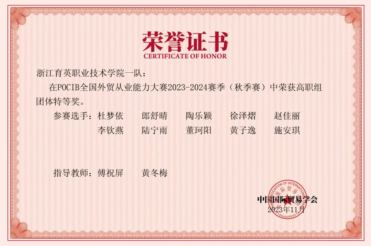 近日,由中国国际贸易学会主办的第十三届POCIB全国外贸从业能力大赛(秋季赛)圆满结束。我校数字商贸学院的国商专业在层层选拔后派出两支代表队,共20人参赛。指导老师傅祝屏、王成伟、黄冬梅和魏巧米老师均来自国商专业竞赛团队。经过长达13天的马拉松式赛程,在指导老师的带领下,同学们展现出了顽强的拼搏精神。最终,两支参赛队伍分别荣获全国团体特等奖和团体一等奖,创下历年来的最佳成绩。
