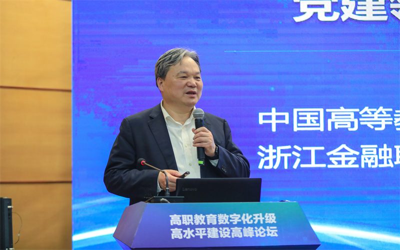 中国高等教育学会职业教育分会理事长、浙江金融职业学院发展咨询委员会主任周建松教授作《党建领航的高职学校关键能力建设》专家报告。他结合实践案例,从提升关键能力是职业教育高质量发展之基、全面提升职业学校党的领导力、以党建统领学校关键能力建设等方面进行讲解。