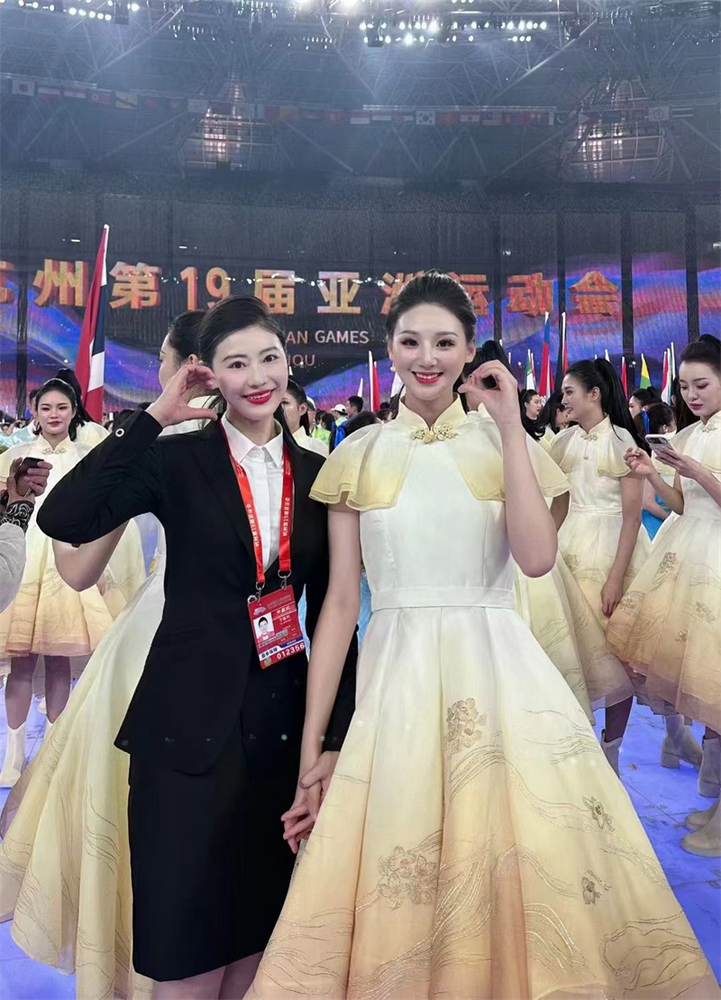 开幕式上,手持“钱塘之韵”引导牌,引导第一个运动员代表团阿富汗代表团入场,并在被镜头对准的20多分钟里,全程持扇微笑,圆满完成任务,感觉很自豪。“台上一分钟,台下十年功”,我们在校期间,每周都有形体训练、礼仪训练、职业形象塑造等课程,还有站姿、走路和表情管理等训练课程,这为我通过引导员选拔奠定了基础。不过亚运会的礼仪训练细节就更加严格了。在训练中我也遇到过困难,体能一度跟不上。每天10公斤负重体能训练,很辛苦,常常分不清挂在脸上的是汗水还是泪水。但是一想到我们代表的是中国的形象,要向全世界展示亚运会开幕式的精彩和美好,训练中的一切辛苦付出也都觉得值得了。