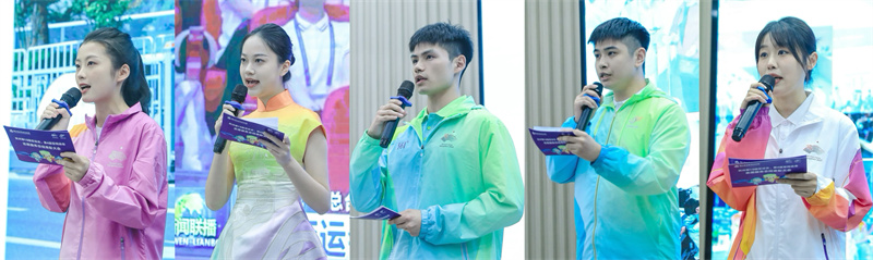 杭州亚运会火炬手、颁奖礼仪志愿者、21会展班陈冉,杭州亚运会颁奖礼仪志愿者、22空乘A班黄奕熳,杭州亚(残)运会医疗服务志愿者、22轨道班叶涛,杭州亚残运会赛会志愿者21网络班丁义,杭州亚(残)运会颁奖领队老师王姣分别围绕关键词“薪火”、“微笑”、“守护”、“闪耀”、“陪伴”讲述青春与亚运的故事。