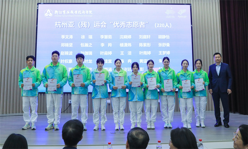副校长徐晓斌为杭州亚(残)运会“优秀志愿者”颁发证书。