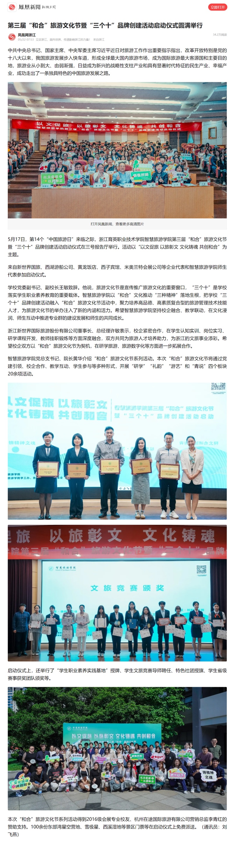 浙江新世界国际旅游股份有限公司董事长、总经理许敏表示,校企紧密合作,在学生认知实训、岗位实习、研学课程开发、教师挂职锻炼等方面深度融合,双方共同为旅游人才培养助力,为浙江的文旅事业添彩。希望校企双方以“和合”旅游文化节为契机,在研学旅游、旅游数字化等方面进一步拓展合作。