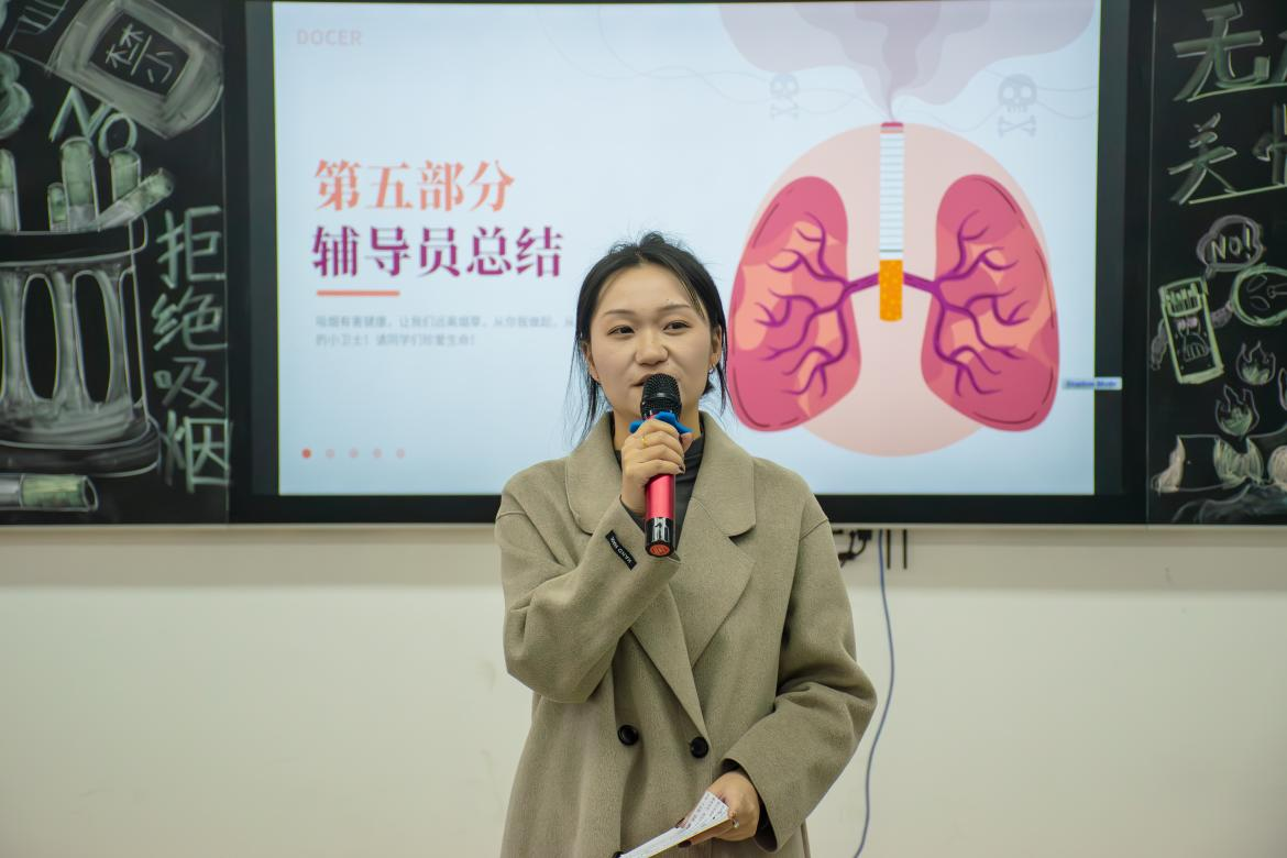 辅导员方燕欣对本场主题班会进行点评,并呼吁同学们认清吸烟的危害,拒绝吸烟,拒绝吸二手烟,共建健康、无烟的校园。