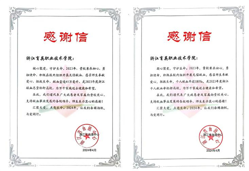 近日,在“青春担当 热血扬帆”——2024年度浙江青年“热血先锋”无偿献血志愿服务主题活动启动仪式上,我校荣获“2023年度千人献血率标杆高校”和“2023年度浙江献血总量标杆高校”。
