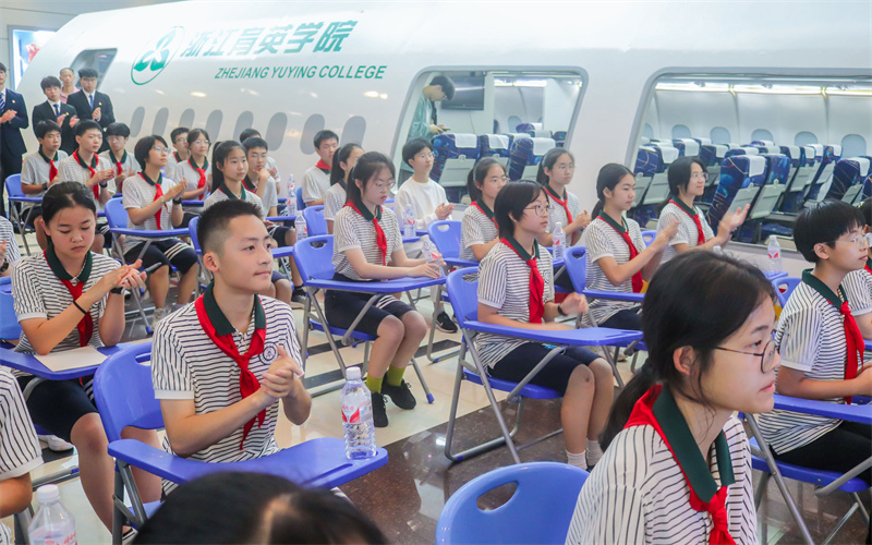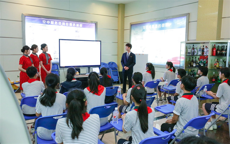在全真模拟客舱服务实训室,民航交通学院大学生志愿者为中学生详细讲解了氧气面罩、救生衣等设备的使用要点,展示正确的穿戴和使用方法,并示范了空中乘务岗位的服务流程。中学生们在大学生志愿者的帮助下,了解机上安全设备,学习航空服务礼仪基本知识和空中急救的基本操作等,他们在实践中体验职业感受,深化对社会主义核心价值观的理解和认同。