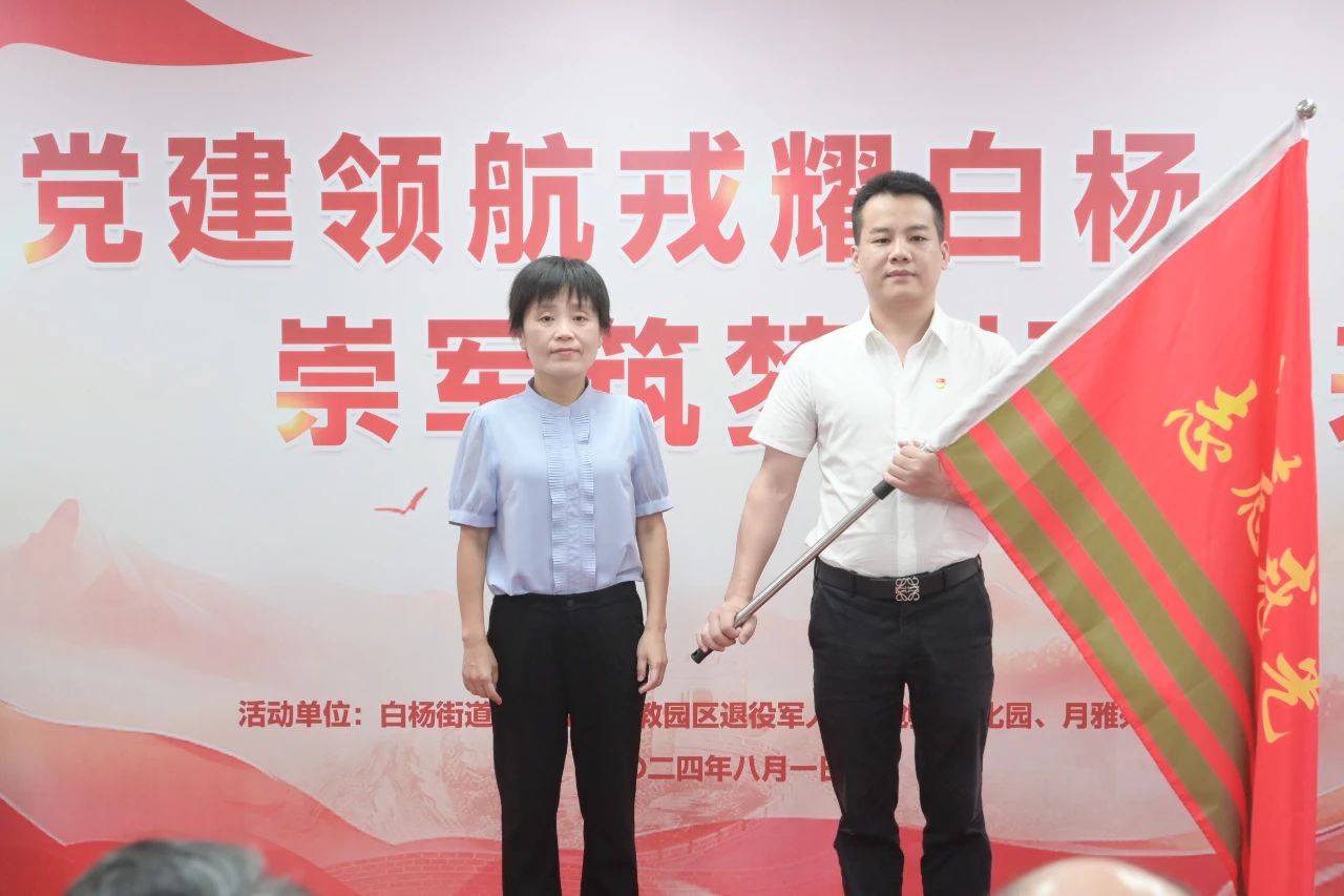 张颖授旗“退役军人党员志愿先锋队——青春戎光志愿先锋队”。