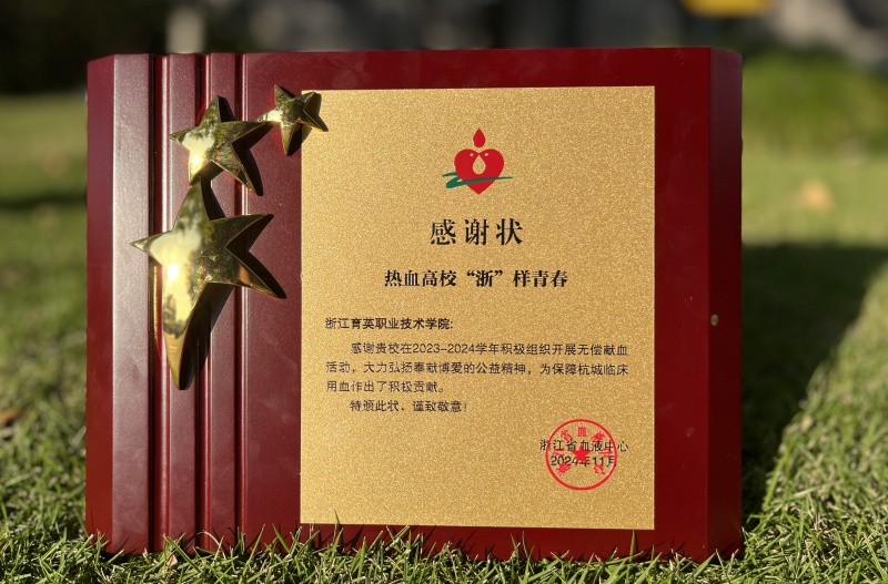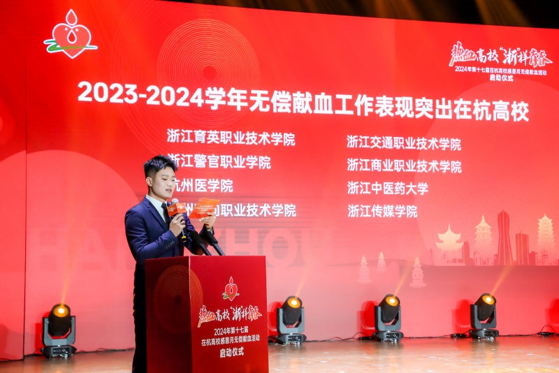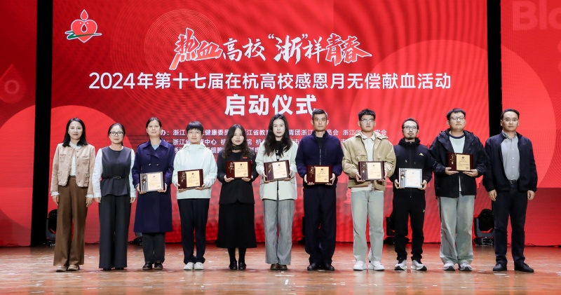 2024年11月6日,“热血高校 ‘浙’样青春”2024年第十七届在杭高校感恩月无偿献血活动启动仪式在杭州医学院滨江校区开展。与会领导为2023-2024学年无偿献血工作表现突出的16所在杭高校颁发感谢状。我校荣获“2023-2024学年无偿献血工作表现突出在杭高校”,千人献血率排名第一。