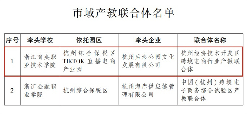学校联合杭州后浪公园文化发展有限公司,依托杭州综合保税区TIKTOK直播电商产业园,申报杭州经济技术开发区跨境电商行业产教联合体,并立项为杭州市第一批市级市域产教联合体建设项目。