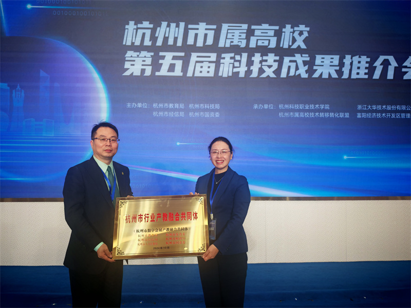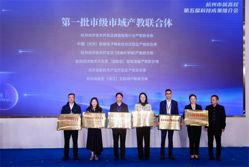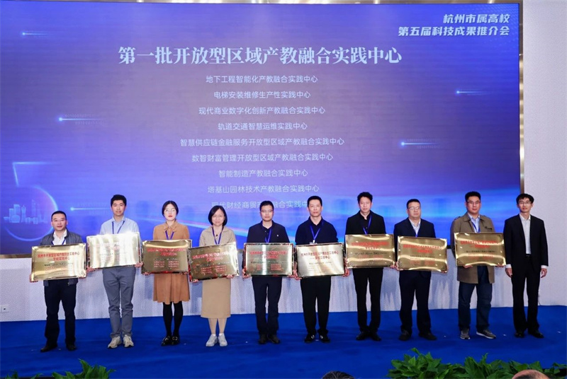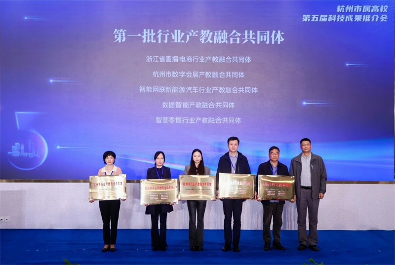 11月9日,由杭州市教育局、杭州市科技局、杭州市经信局、杭州市国资委联合主办的杭州市属高校第五届科技成果推介会举行,会上宣读了入选项目名单。市发改委、市经信局、市教育局、市人力社保局、市国资委等市级部门共同为联合体、共同体和实践中心授牌。我校党委书记谢鑫,副校长严志嘉,数智商贸学院院长欧阳驹,智慧旅游学院院长黄华参加推介会授牌仪式。