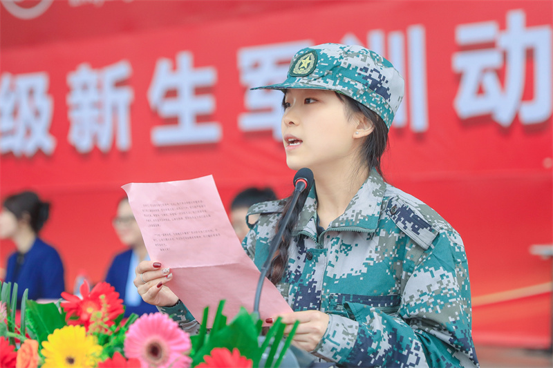 军训士兵代表、创意设计学院24人物形象设计C班沈佳雯发言,表达了对军训生活的憧憬和决心。