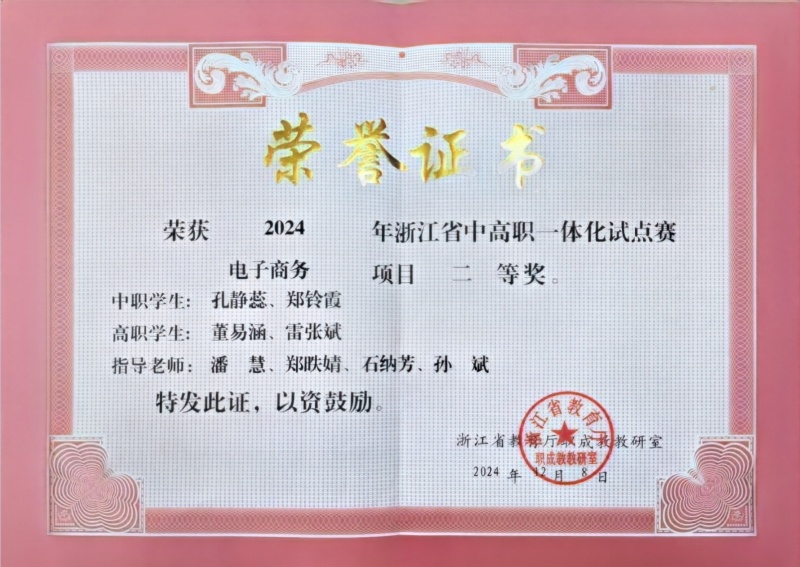 12月6日至8日, 2024年浙江省中高职一体化试点赛“电子商务”赛项在嘉兴职业技术学院举行。我校数智商贸学院电子商务专业学生董易涵、雷张斌和金华实验中学学生孔静蕊、郑铃霞组成的竞赛团队以全省第四名的成绩获二等奖。指导教师为我校数智商贸学院教师孙斌、石纳芳和金华实验中学教师潘慧、郑昳婧。