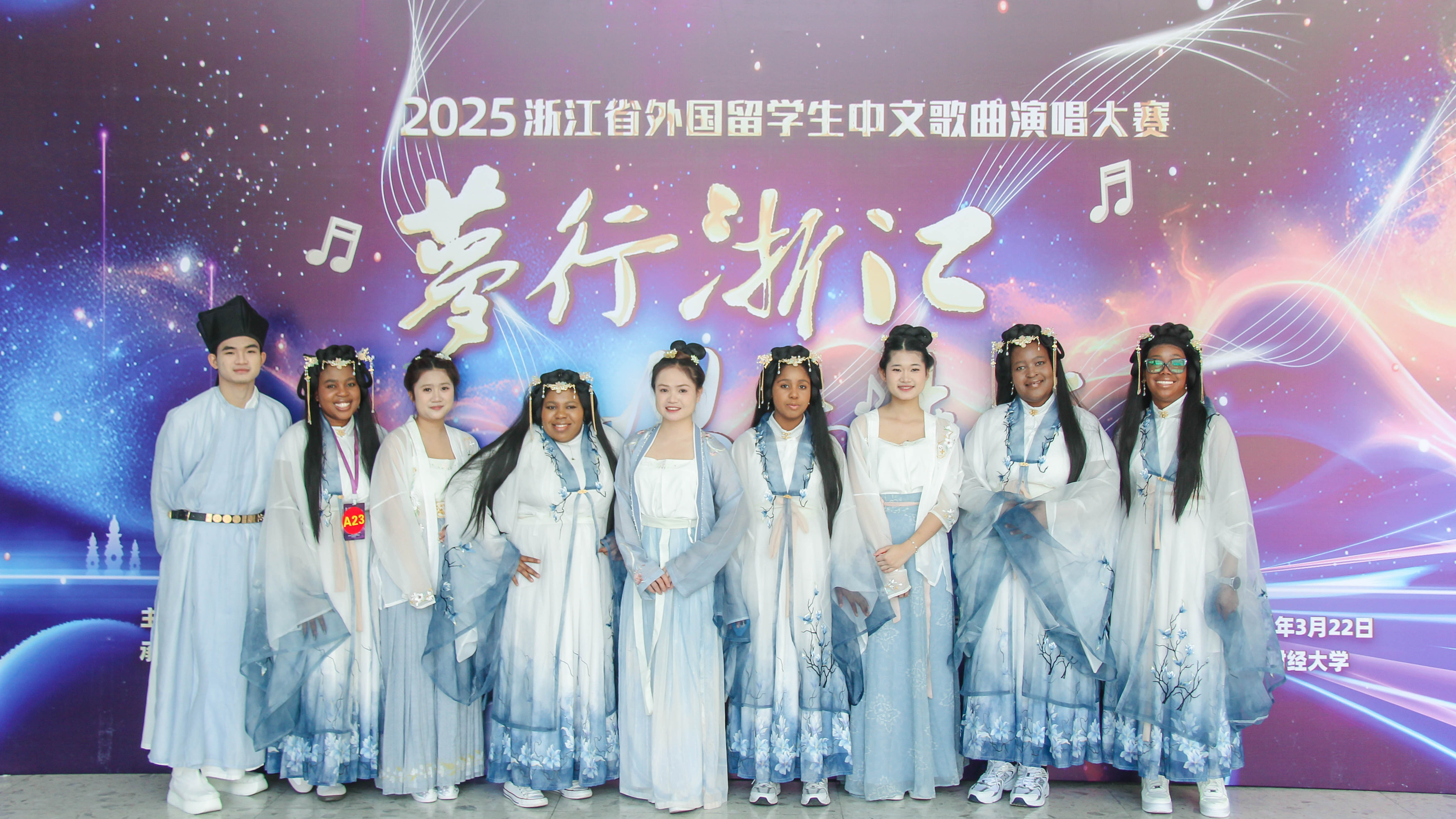 3月22日,由浙江省教育厅、省政府新闻办、省外事办、浙江广电集团主办,浙江教科影视频道与浙江财经大学承办的"梦行浙江·唱响未来"留学生中文歌曲大赛在浙江财经大学拉开帷幕。全省高校170支留学生队伍同台竞技,其中我院23级酒店(老挝班)通卡、安在欣、芳欣、娜飒枫身着宋制汉服,以一曲《声声慢》将江南韵味与异域风情交融,用歌声在四十余国青年间编织文化共鸣纽带。大赛通过音乐架起中外交流桥梁,展现留学生眼中多元文化交融的浙江魅力。