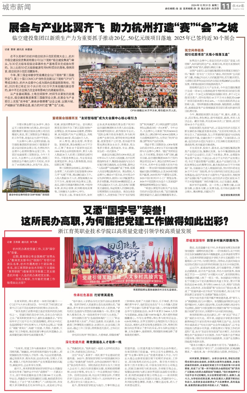 “育英是浙江省最早建立基层党组织的民办院校之一。党建引领的是办学方向,没有公办与民办之分。”育英职院党委书记、副校长谢鑫表示,“学校始终牢记习近平总书记的殷殷嘱托,将校史中的红色基因厚植于学校发展与人才培养全过程,以‘党建红’领航‘育英红’,构建‘大党建、大思政、大教育、大融合’的工作格局,推进党建与事业的深度融合,以高质量党建引领学校高质量发展。”