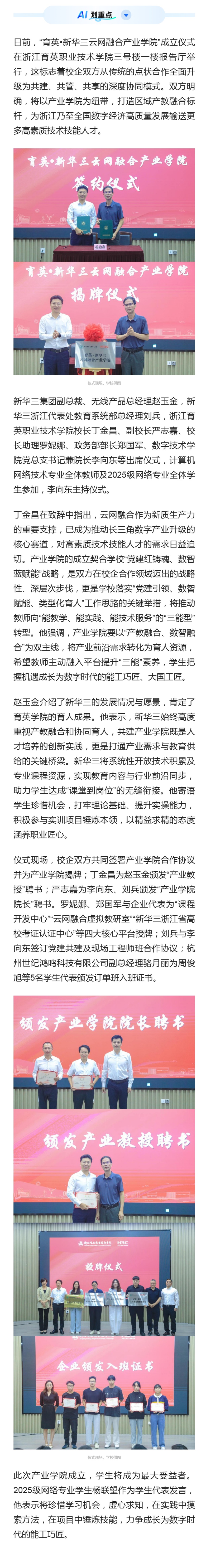 【潮新闻】校企协同打造数字人才培养新标杆!育英•新华三云网融合产业学院成立