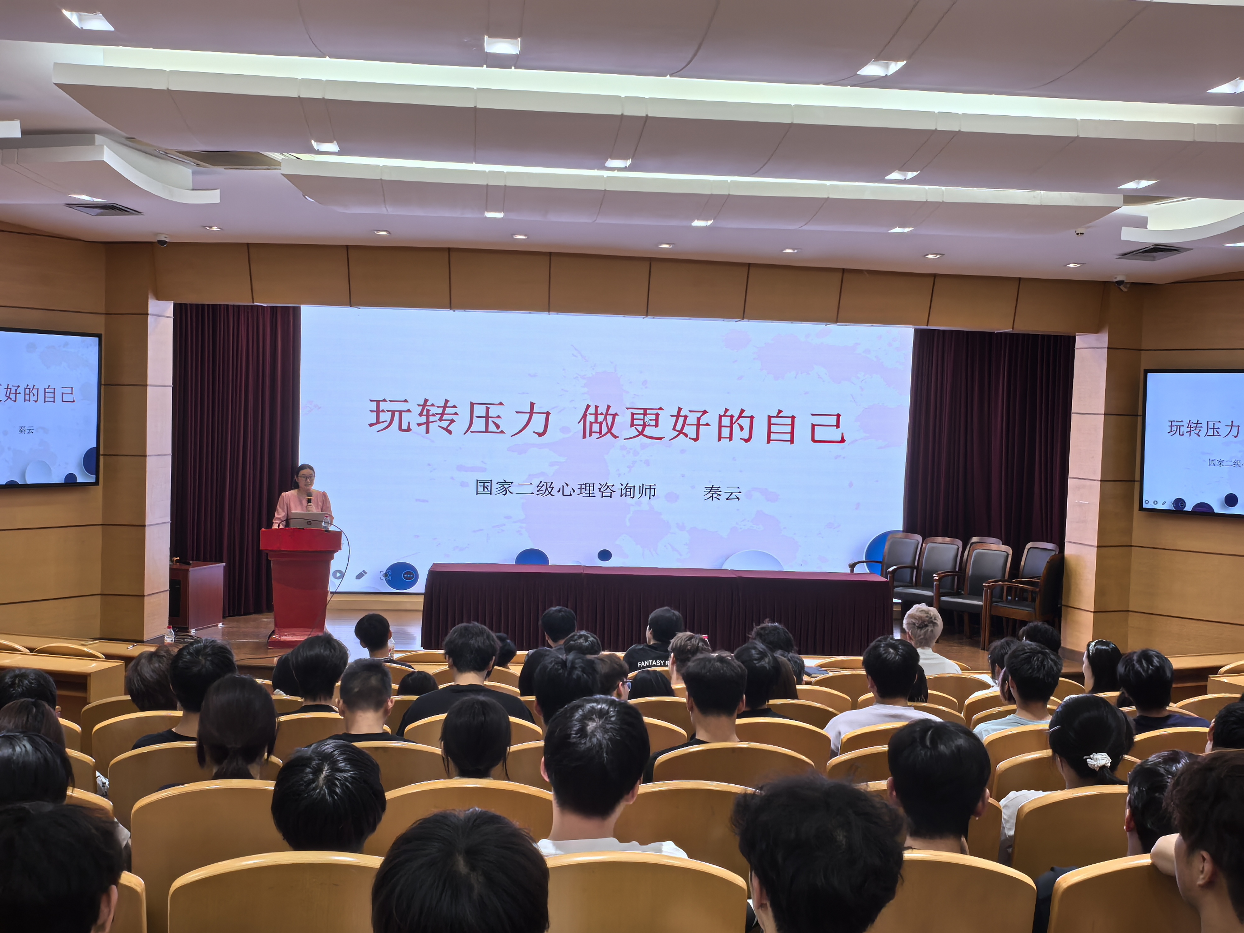 讲座从“压力可视化”互动环节开始,借助动态压力图和压力自评等方式,引导同学们觉察和正视自身的压力状态。在讲解压力应对策略时,秦老师通过双关图解读、情景模拟和互动游戏等多种形式,为大家介绍了四大心理调适“法宝”:认知转换、思维重构(基于埃利斯ABC理论)、社会支持系统以及放松训练,鼓励同学们转变消极思维、主动利用身边支持资源、掌握呼吸放松等实用技巧,从而有效缓解焦虑、增强心理韧性。