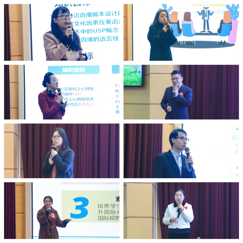 决赛现场,14位教师精神饱满,自信沉稳。教学设计陈述环节,教师们围绕所授课程,从教材选用、学情分析、教学目标、教学重难点及策略、教学方法、教学过程以及教学反思等方面进行详细阐述,展示了清晰的教学思路和富有创新的教学设计。课堂教学实录部分,教师们从学情出发,紧扣教学重点和难点,问题导入、行动导向,适时互动、释疑,教学过程深入浅出、精彩纷呈,充分展示了理实一体、数智赋能的课堂教学创新探索与实践。