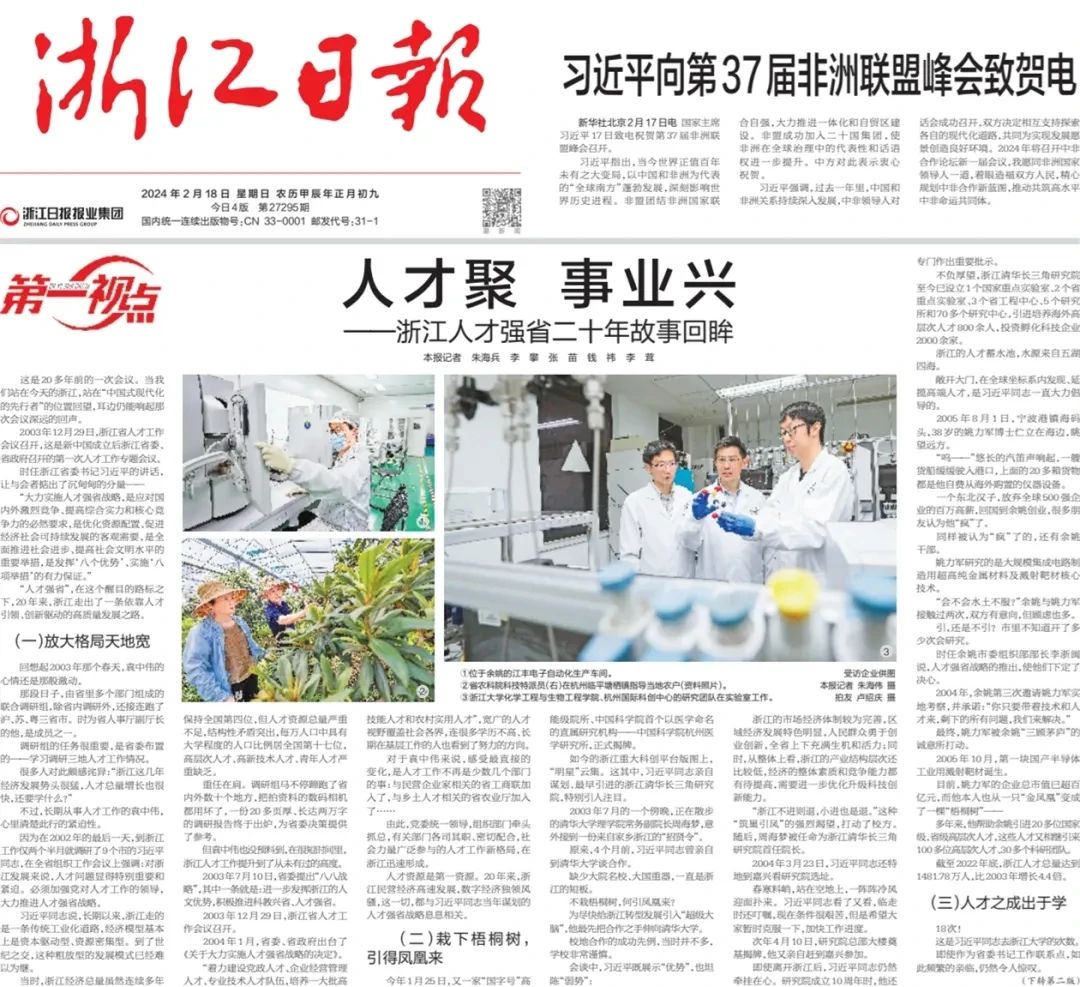 2月18日,《浙江日报》头版头条第一视点栏目推出《人才聚 事业兴——浙江人才强省二十年故事回眸》专题报道,学校作为职业技术教育特色案例呈现在报道第三部分“人才之成出于学”。文中写道“把习近平同志对职业教育‘大有可为’的嘱咐转化为‘大有作为’的生动实践,身为民办高职院校的浙江育英,走出了一条‘为现代服务业培养高素质应用型职业人’的特色发展之路。”报道在潮新闻客户端同步推出。